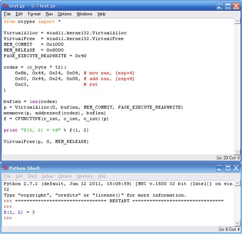 PythonでJITをしてみました。32bit Windowsに依存したコードです。【注】PyPyのようにPythonのコードをJITコンパイルしたわけではありません。CPythonからバイナリ直書きでネイティブコードを生成して実行しました。VBAでも同じことをやりましたが、それに比…